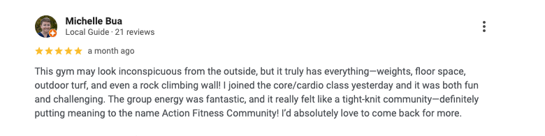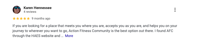 Action Fitness Community is a private, body positive, strength training studio and fitness community for individuals looking to reach and maintain their fitness goals through balance and realistic lifestyle changes. We are focused on accountability, motivation, and results.